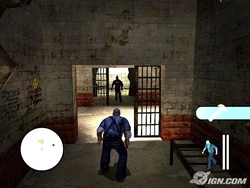 The player reaches the staircase room beyond cell block K where a Save Point can be activated. Two Smileys, including Fug who declares that he will end this once and for all, goes downstairs from the second floor to look for Cash. The Director gives him his next instructions to get up to the walkway and head for the shower block. Cash can deal with the pair of crazies by any means possible before taking the gun from one of these Smileys to prepare himself for the firefight up ahead.