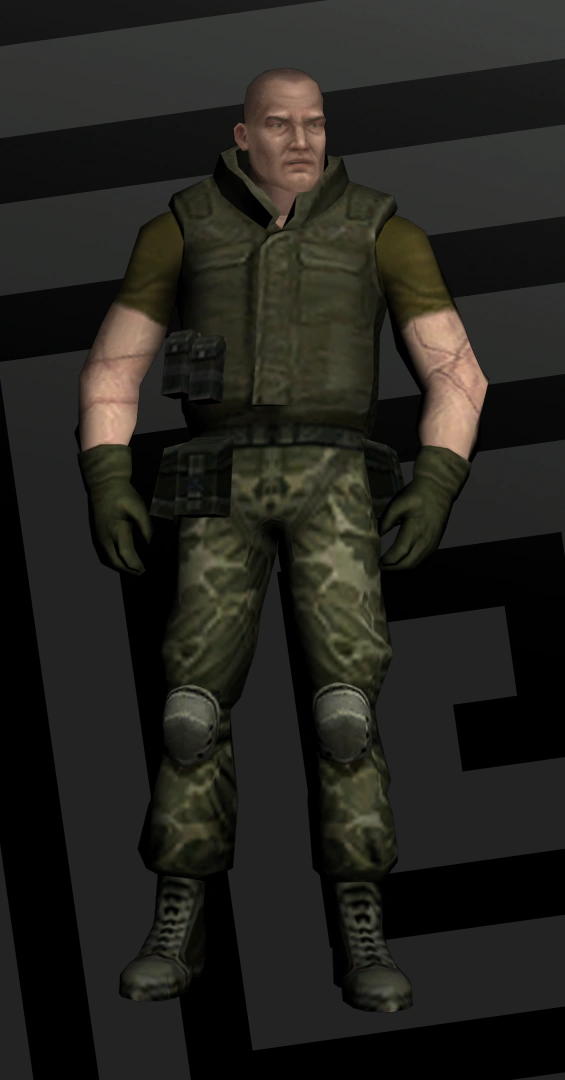 - Second one with also full covered mask with little differences, it has holes for breathing, no wires, and green colored goggles instead of red ones with only two unlike the first one there are four, fully armor torso with gloves, cargo pants on equipment on the belt, and shoes.